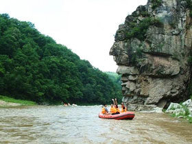 红河峡谷漂流景区,位于辽宁省抚顺市清原满族自治县红河谷国家森林公园内,全长12.8公里,距清原县城,国道“202”线沈吉铁路10公里,距抚顺市100公里,距沈阳160公里。红河峡谷系长白山余脉岗山支脉经多年切割而形成的“U”型峡谷,素有东北小三峡之称。谷内河水丰盈清澈,急缓交错;两岸山川锦绣,怪石林立,300多种动植物竟相繁衍,和谐共存,呈现出生机昂然,风情万种的原始生态。红河峡谷漂流是按国家AAAA级景区建设的,服务功能完善